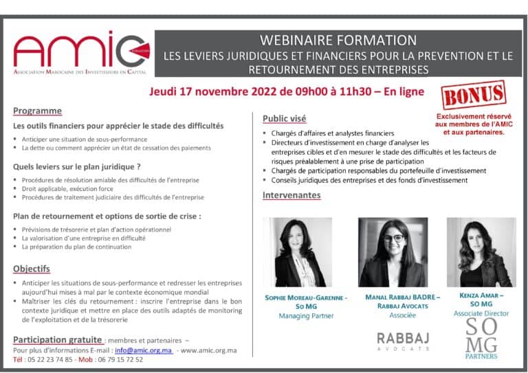 • Maîtriser les clés du retournement: inscrire l’entreprise dans le bon contexte juridique et mettre en place des outils adaptés de monitoring de l’exploitation et de la trésorerie